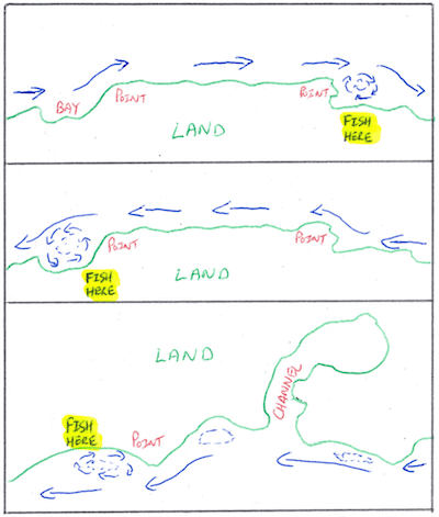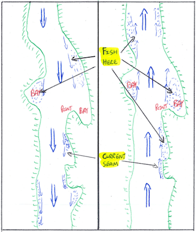 Some bays fish better on the ebb tide and some on the flood. If you follow the back eddy and tidal seams that is where you will find fish. (See Figure 3 for examples of bay with different tide current creating fish holding spots.)