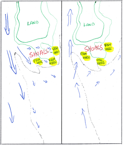 You want to fish between the seam and the rock wall. Keep in mind these are regions where you need to be comfortable with handling your boat. The tide will catch your boat’s bow and affect its heading. (See Figure 1 for illustration of current seam and back eddies created by points.)