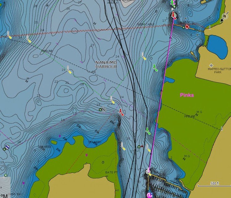 That portion of 17-14 in Nanaimo Harbour shoreward of a line from the end of the most southerly dock located at the Nanaimo Yacht Club (49 degrees 10.614’N and 123 degrees 56.336’W) to the Pedestrian Fishing Pier (Crab Dock) located at Swy-a-lana Lagoon (49 10.264’N and 123 56.051’W).