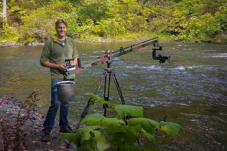 EJ: It is amazing. Most of the time when I am filming the salmon, I am stationary in a pool or back eddy, laying motionless while they swim around me. I generally do not snorkel down the river with my camera gear. A lot of the time I am only in a few inches of water, with most of my body on shore. I also use a camera on a moveable arm called a crane or jib. This enables me to swing the camera into the water with the salmon so I don’t disturb them, and it keeps me out of the water, and therefore warmer. I generally only use this method for spawning sequences when they are the most sensitive to disruption. I mostly prefer to be in the water though, witnessing and filming their amazing behaviors.