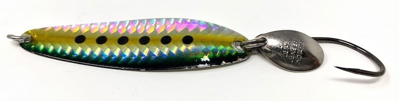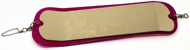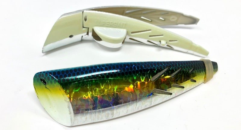 This bait-holding lure will turn your day of fishing into a luau. Open the cavity and put in your bait, like a fillet of anchovy or herring, and you are good to go. There’s also a scent pad inside that will retain all that irresistible smell. Troll it, cast it, back bounce it, or wear it as jewelry—your choice, it’s all good. Mahalo, Brad. Mahalo.