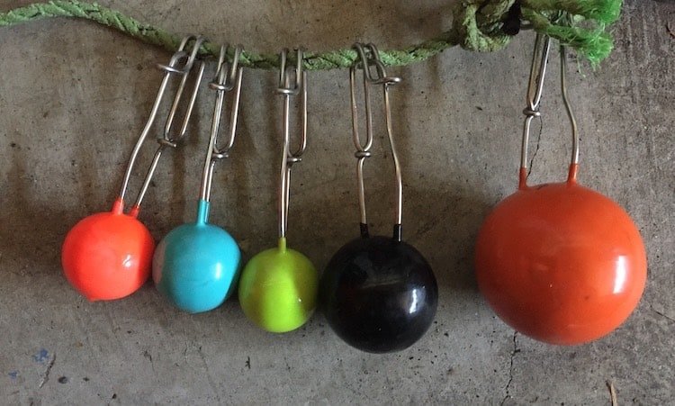 My setups consist of a 5-lb ball at the very end of my line. 15 ft up from that goes my first trap, 20 ft from there goes my 2nd trap, 15 ft from there goes a 3-lb line weight, and then every 60 to 100 ft. I like to attach a 1-lb line weight just to keep my line straight up and down. The 3-lb line weight on my setup plays a very important part, keeping the traps on the bottom nice and flat. If your first trap continually comes up with 0 prawns, it might be because your scotchman/float is lifting it off the bottom. I also lined my square traps with some coil lead, just to help them land properly.